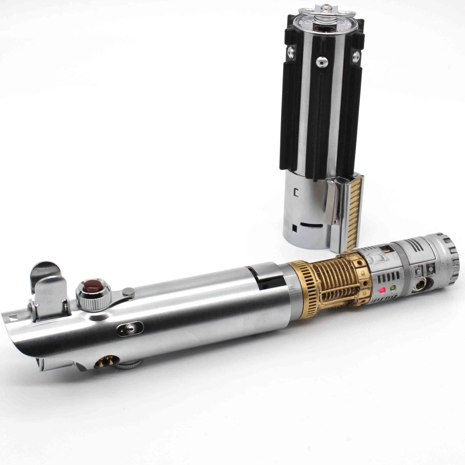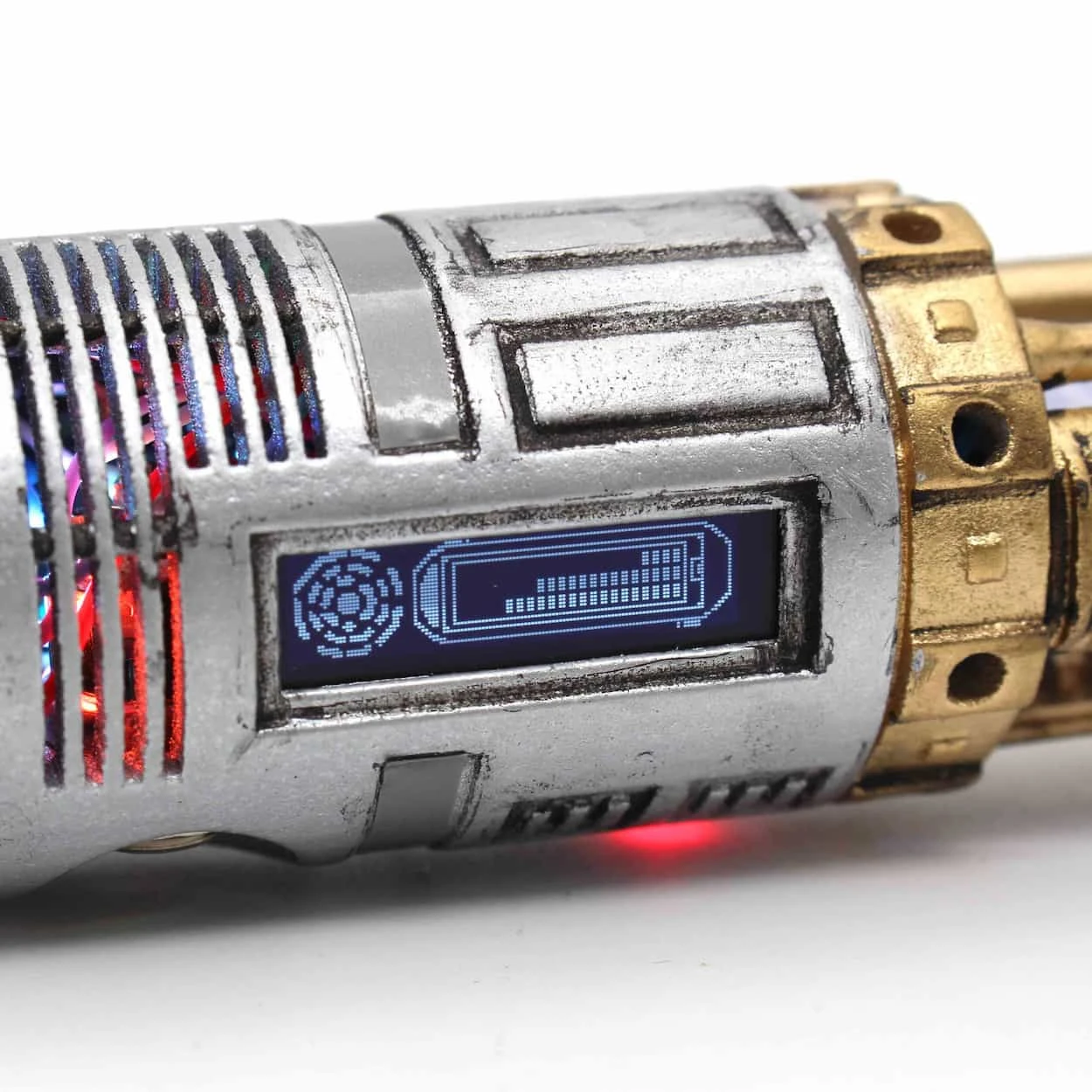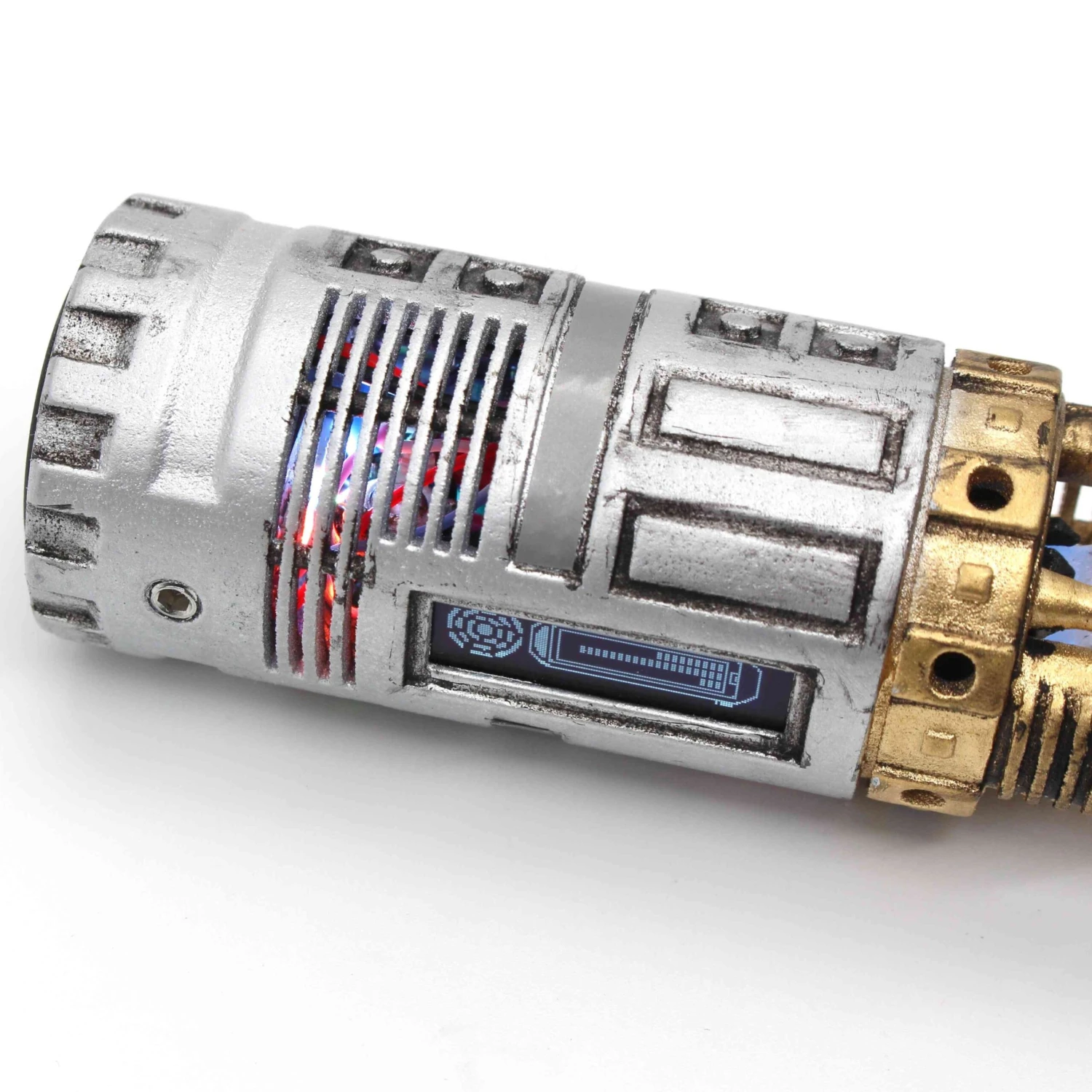 The original lightsaber that started it all. This 89 sabers graflex can be configured to A New Hope, Empire strikes back and The force awakens. Installed by Chris at Sabersense, using his incredible Warrior chassis, featuring full crystal chamber with genuine quartz crystal, accent LED’s, two summary operation, and OLED screen. The chassis is 3d printed and the painted and weathered to give extra realism. This saber comes with a 1″ blade. Collectors Edition magazine included. Not designed for duelling