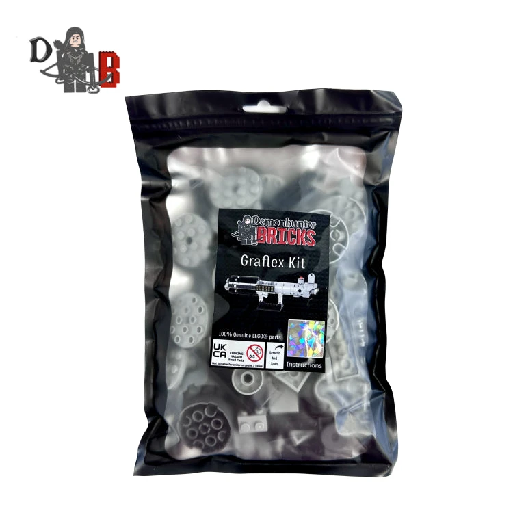 Build your very own custom Graflex Saber hilt out of genuine LEGO® pieces. The product comes unassembled in a resealable pouch, with a revealable QR code on the front to download the instructions and build the product as pictured with the stand included.