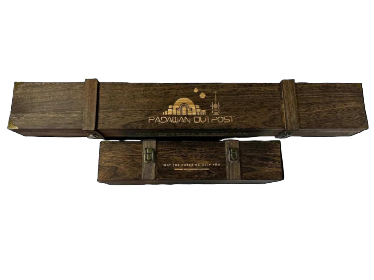Elevate your lightsaber experience with a Padawan Outpost premium rustic wooden box.